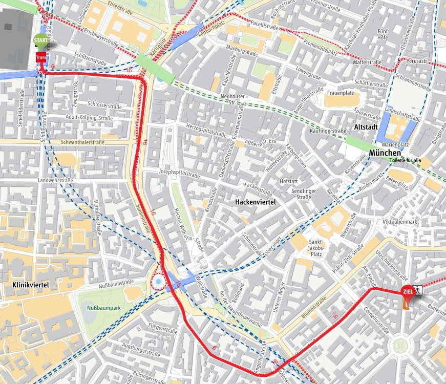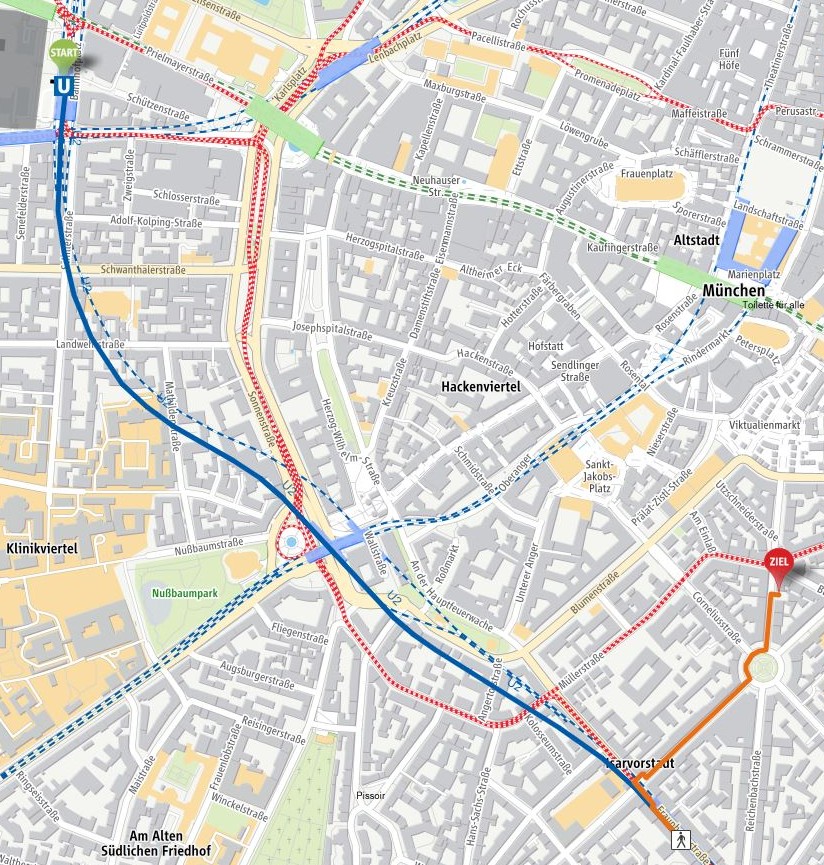 Oder Sie nehmen die U-Bahnen 1 oder 2 zur Fraunhoferstraße und gehen über die Klenzestraße zum Gärtnerplatz