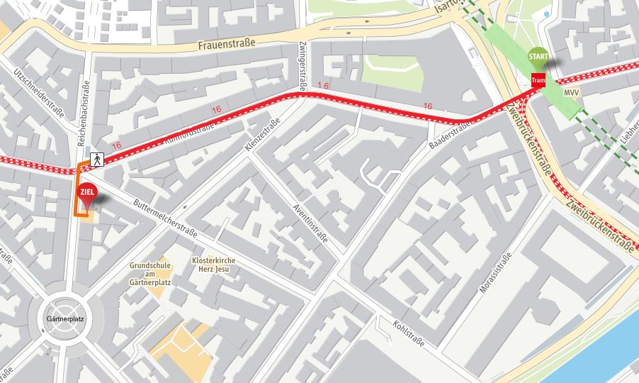 Steigen Sie an der S-Bahn-Station Isartor (Anschluss Trambahn 16/17 bis Reichenbachplatz),