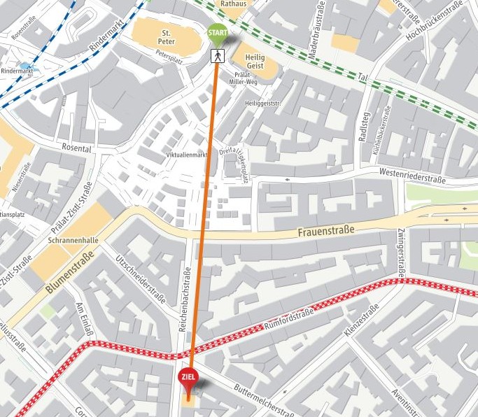 (Alternativ: Sie fahren entlang der Isar und biegen am Deutschen Museum ab zum Isartor. Vor dem Tor fahren Sie links wiederum auf den Altstadtring bis zum Viktualienmarkt, dort links in die Reichenbachstraße abbiegen.)